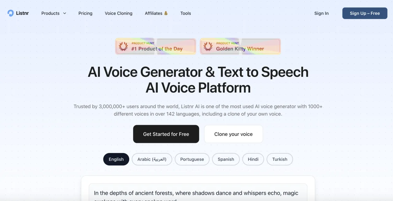 Listnr fue hecho pensando en los podcasters. Además de darte locuciones realistas, también te permite alojar y publicar tus podcasts directamente. Esa combinación es algo que la mayoría de los competidores no ofrece. Las voces cubren bastantes acentos, y la clonación funciona bien también. Para cualquiera que esté creando contenido orientado al audio, es una opción completa e interesante.